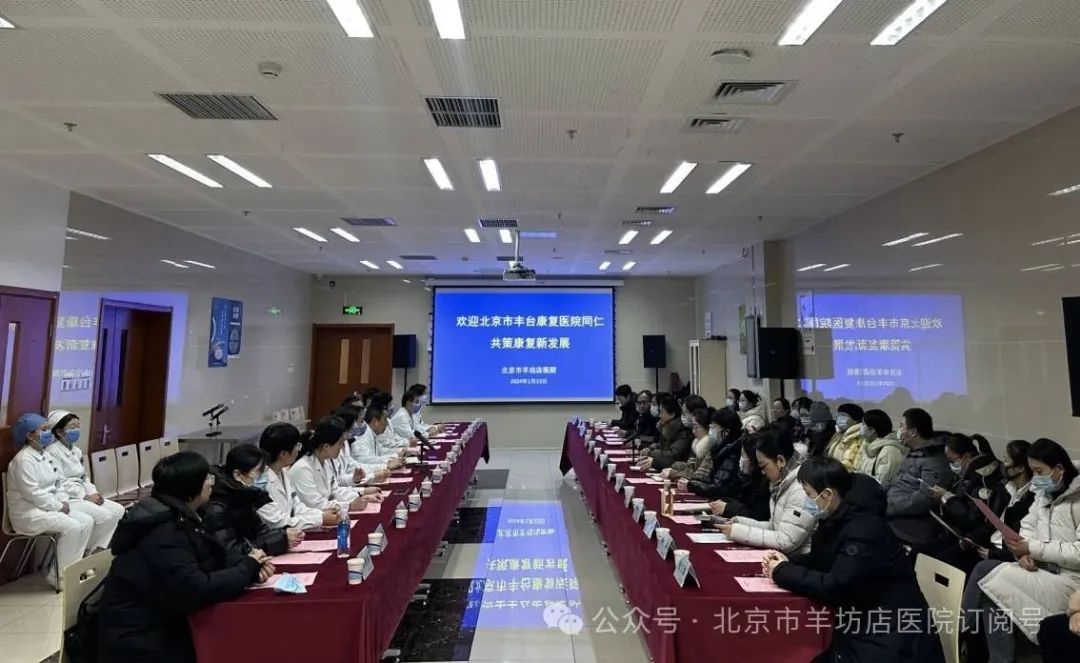 作为2021年同一批转型康复专科医院的兄弟单位,为进一步提升康复诊疗专科技术水平,共策康复新发展,2024月1月23日下午,北京市丰台康复医院院长刘继霞带领副院长王小刚和张静及其临床和职能科室负责人一行30余人到我院进行参观交流。岳滨院长带领医院领导班子成员、行政和临床主任、护士长热情接待了来访团队。岳滨院长代表领导班子及全院职工对本次来访的各位同仁表示热烈欢迎,为了让参观团更好的了解我院,首先向参观团展播了我院医护团队自主拍摄的医院发展历程纪录片《百年医院沐风雨
