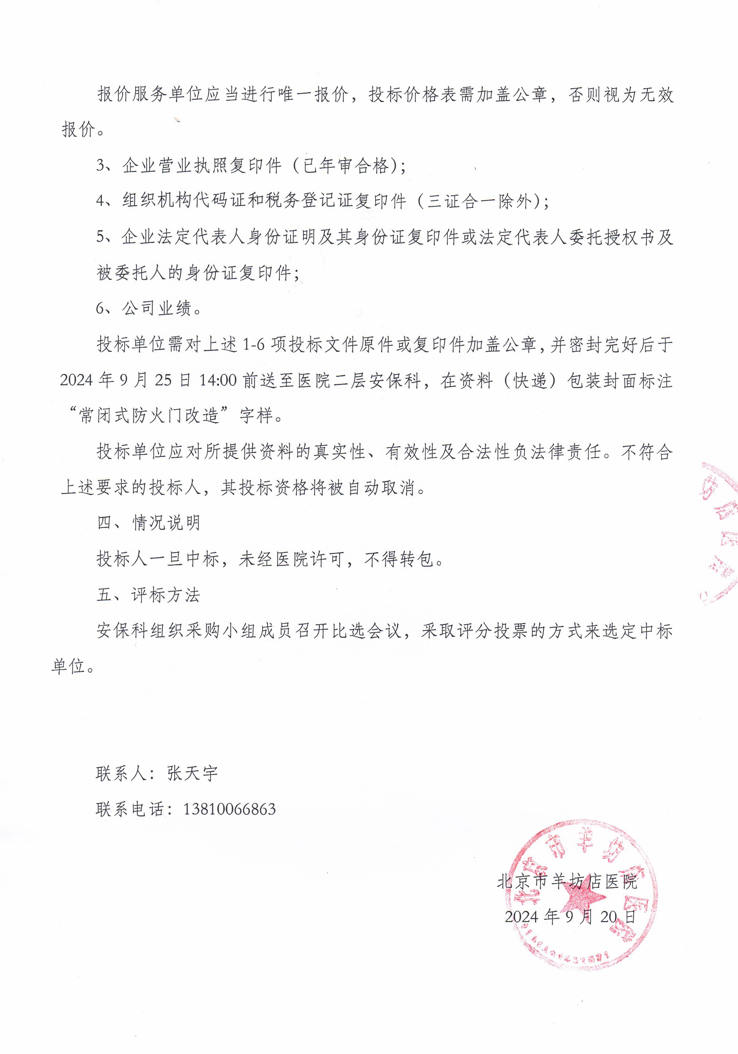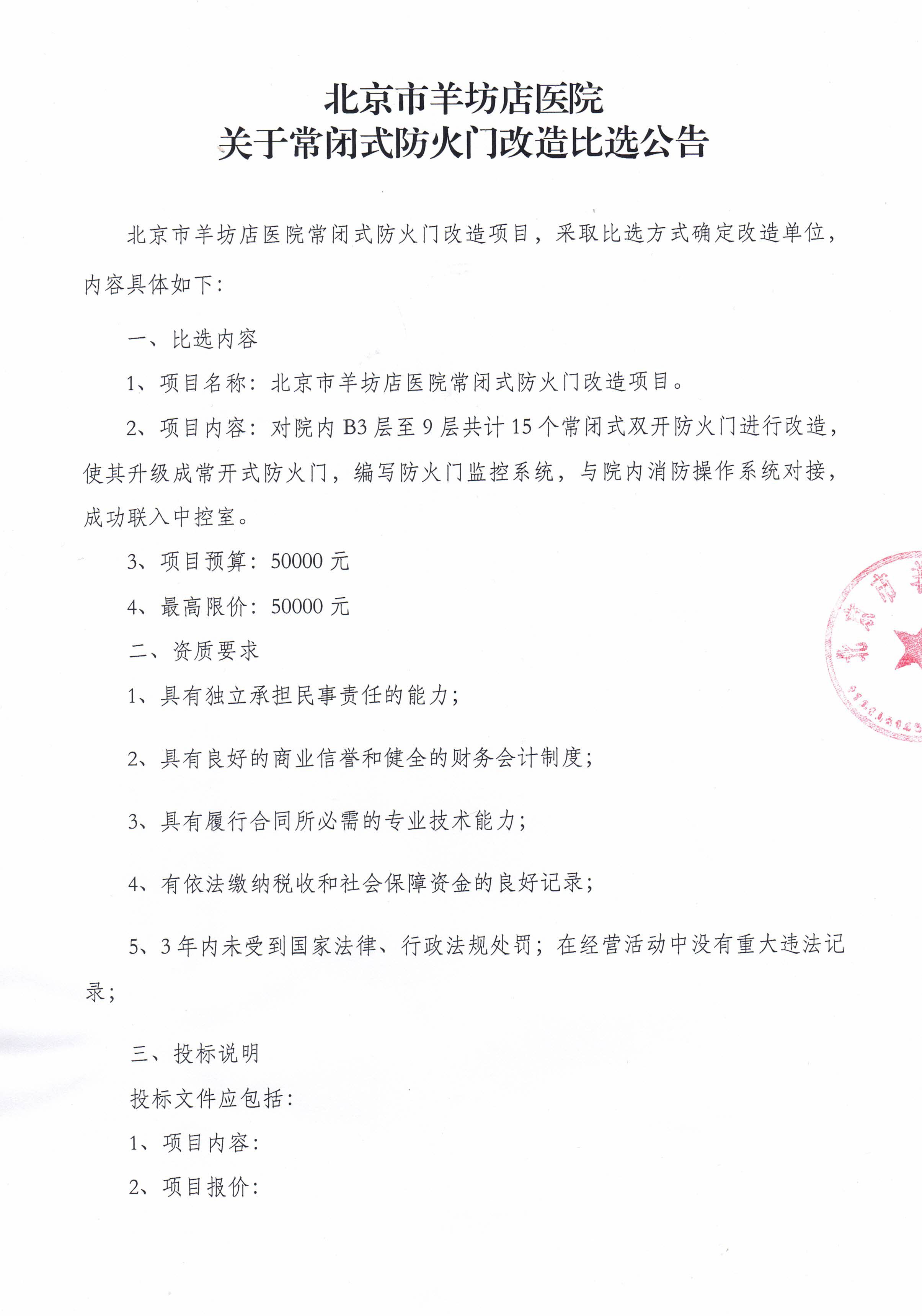 北京市羊坊店医院关于常闭式防火门改造比选公告