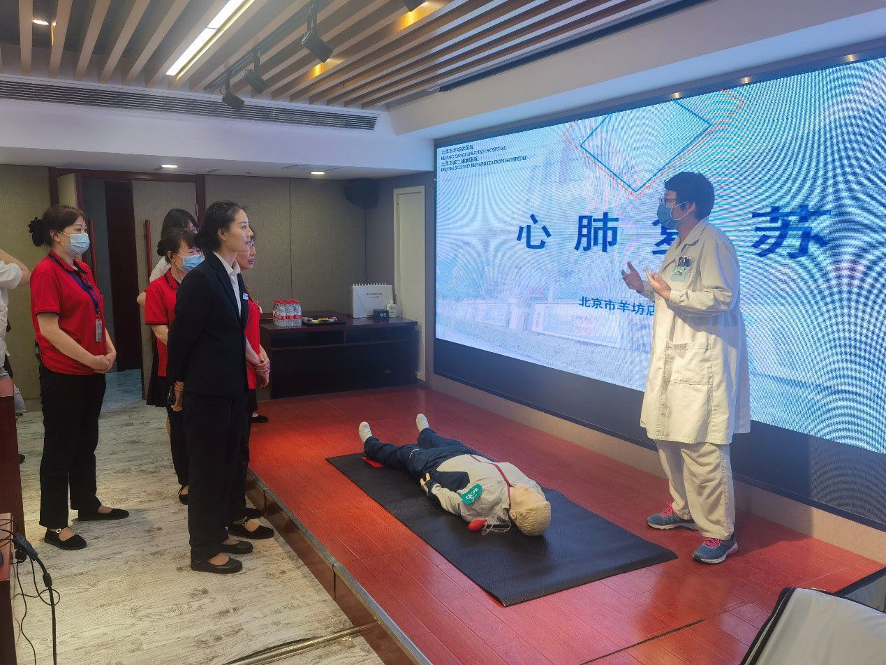 最后内科医生李述为工作人员详细讲解了心脏骤停等意外事件的急救处置知识,并现场进行操作演示。在实际操作过程中,李述首先在模拟人上进行心肺复苏过程示范,并对大家的现场操作进行一对一指导和纠正,通过此次培训不仅加深了工作人员对心肺复苏理论知识的理解,还大大提高了酒店工作人员的急救能力和水平。